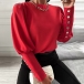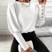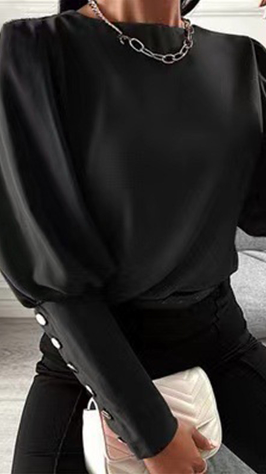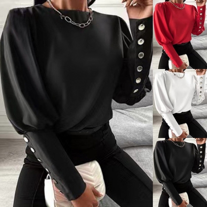 Fashion Button Lantern Sleeve Round Neck Solid Color Top