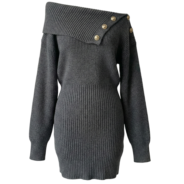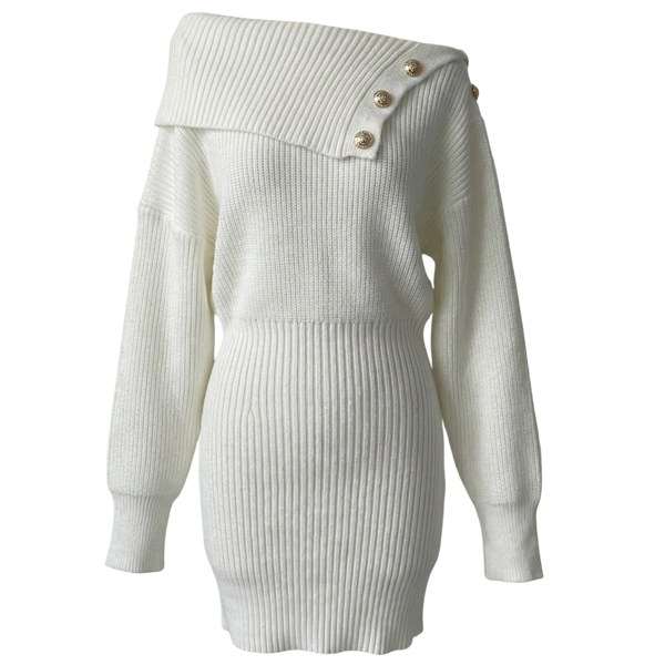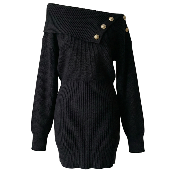This knitted dress features structured button lapel styling with dramatic batwing sleeves and comfortable knitted bodycon construction for modern sophisticated elegance. Style with boots and casual jewelry for relaxed coordination.