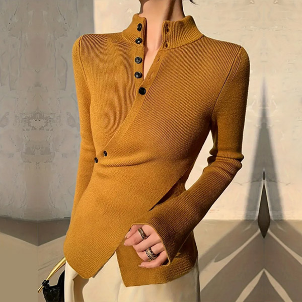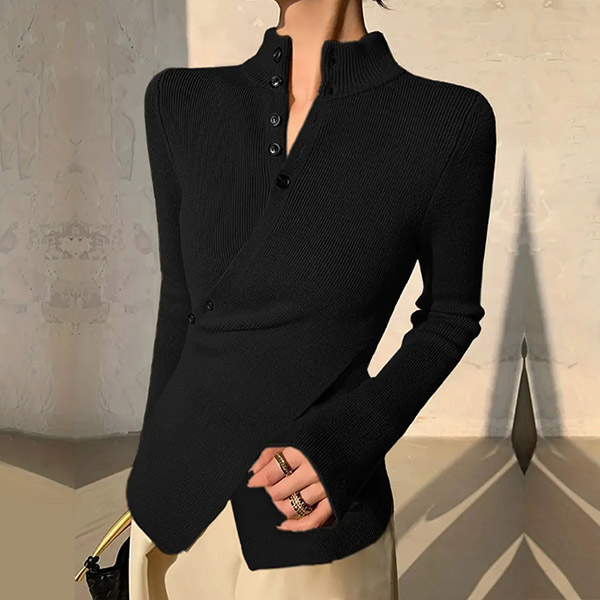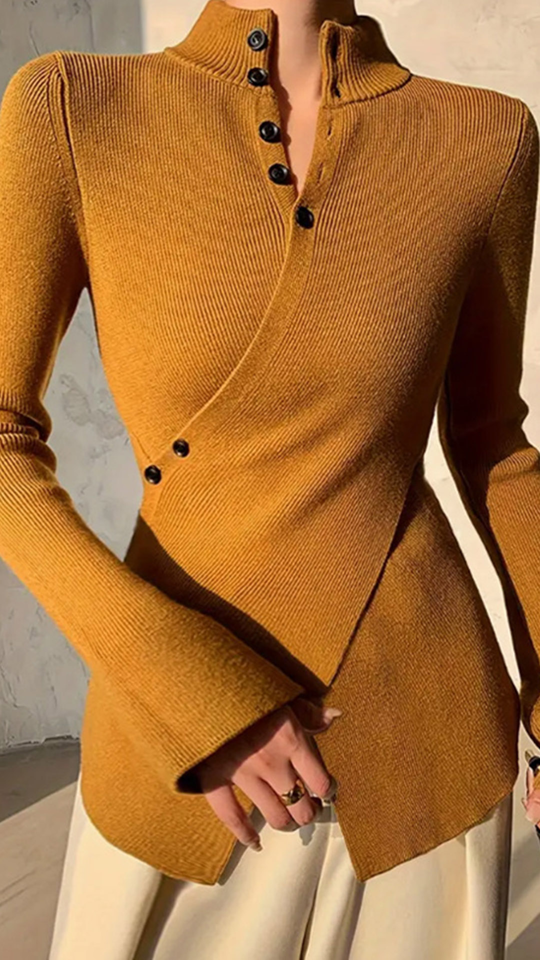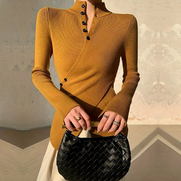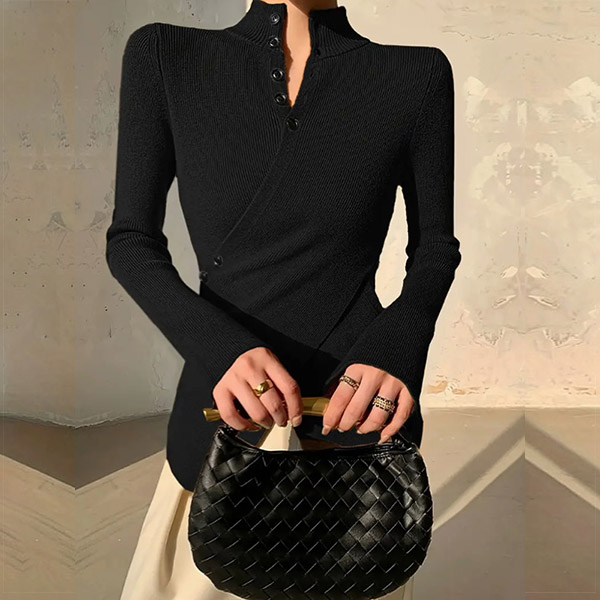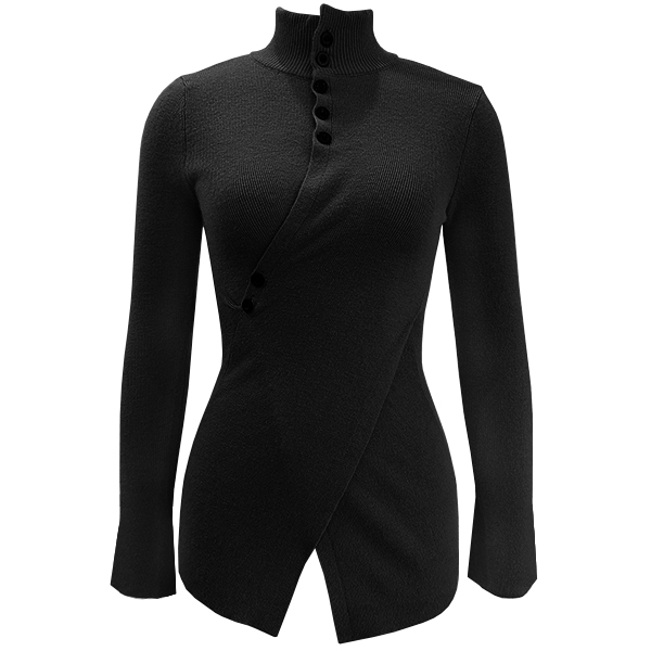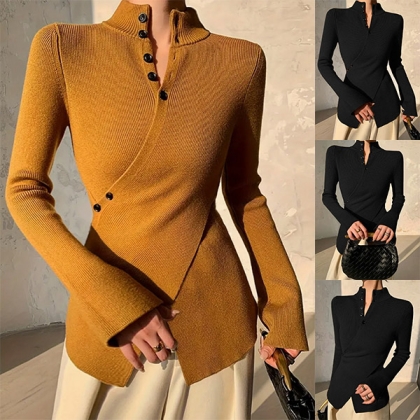 A fashion shirt! The mock neck with button details adds a sophisticated touch to the shirt, creating a sleek and polished look. While the irregular hemline adds a unique and edgy flair to the shirt, making it a statement-making piece. Wanna have a try?