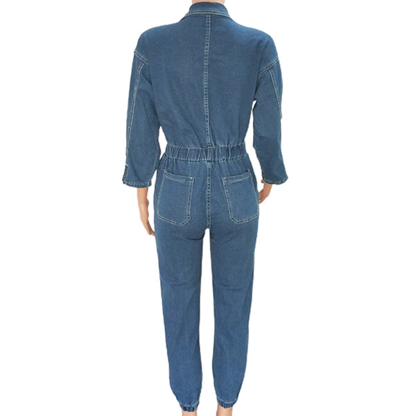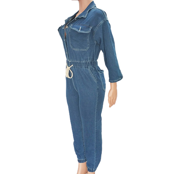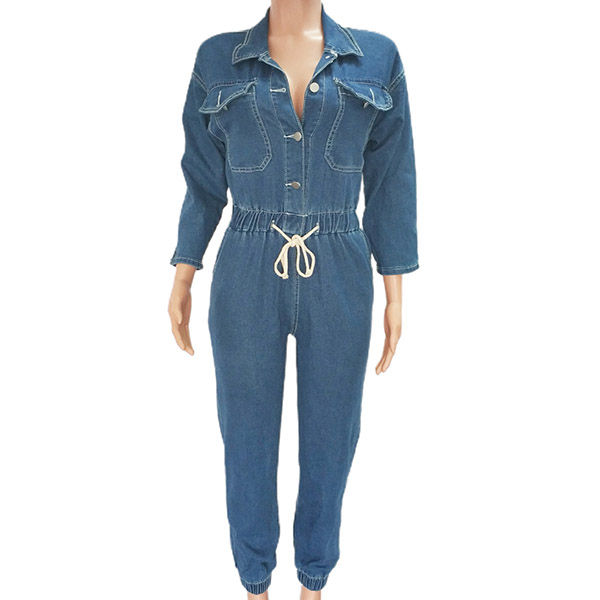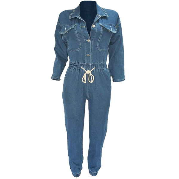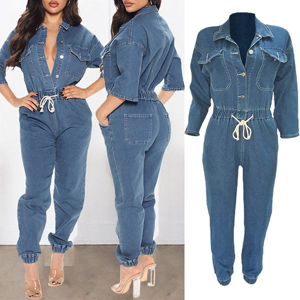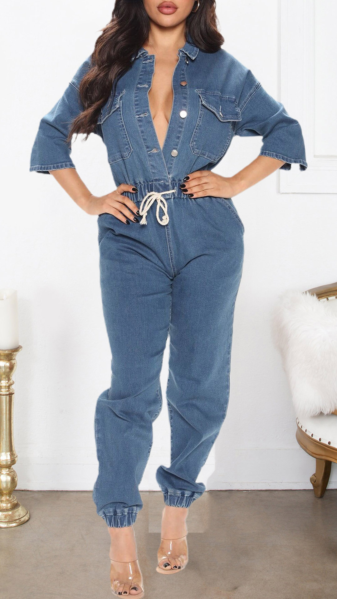 This denim jumpsuit features button stand collar, elbow-length sleeves , elastic drawstring waist which adds a refined and polished touch to the overall look. Wanna have a try?