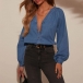 Look at this denim shirt!The V-neckline adds a touch of femininity and sophistication to the shirt, while the long sleeves offer coverage and a polished look. The button details provide a classic and timeless touch, making this denim shirt a versatile and essential wardrobe staple. It combines classic denim with a modern and trendy design.