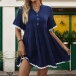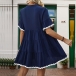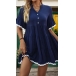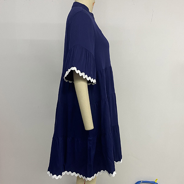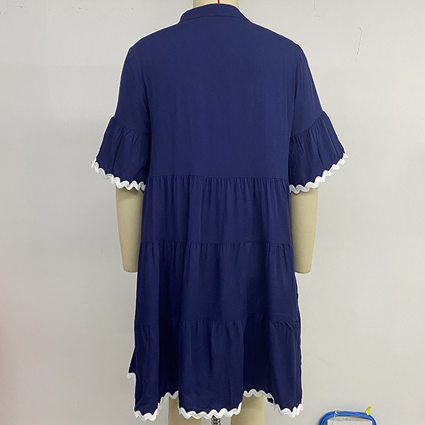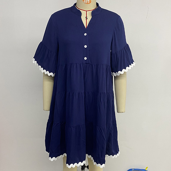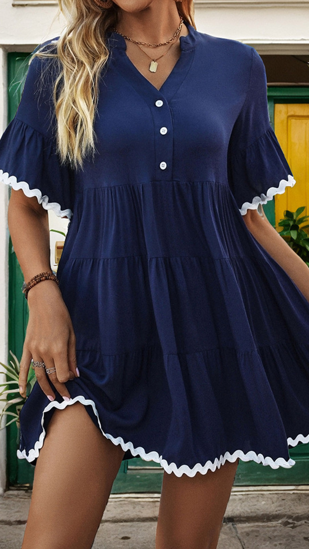 Fashion Button V-neck Short Sleeve Contrast Color Wave Printed Hemline Dress