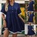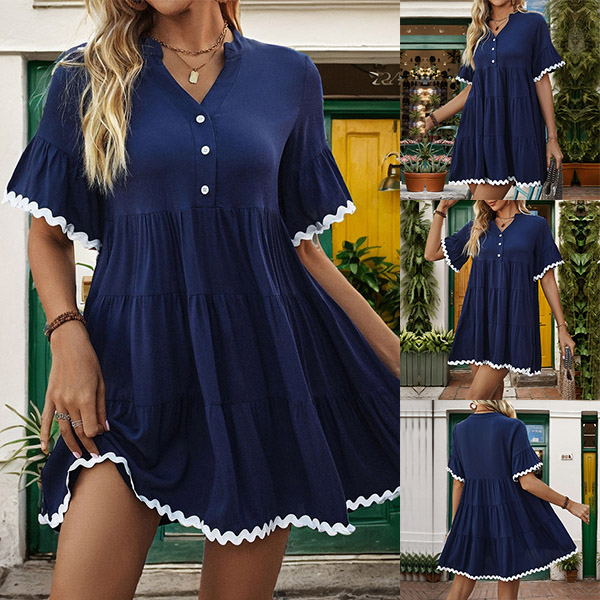 Look at this dress! The classic V-neckline and short sleeves create a timeless silhouette, while the contrast color wave-printed hemline adds a modern, dynamic touch.Wanna have a try?