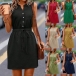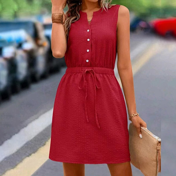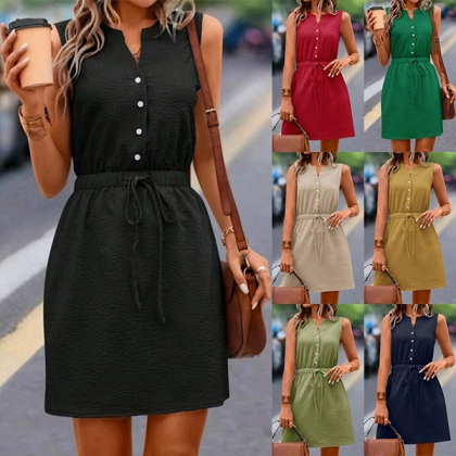 This fashionable mini dress features a V-neckline with button detailing, a sleeveless silhouette, and an elastic drawstring waist, creating a flattering and adjustable fit. Pair with sandals or sneakers for a laid-back look!