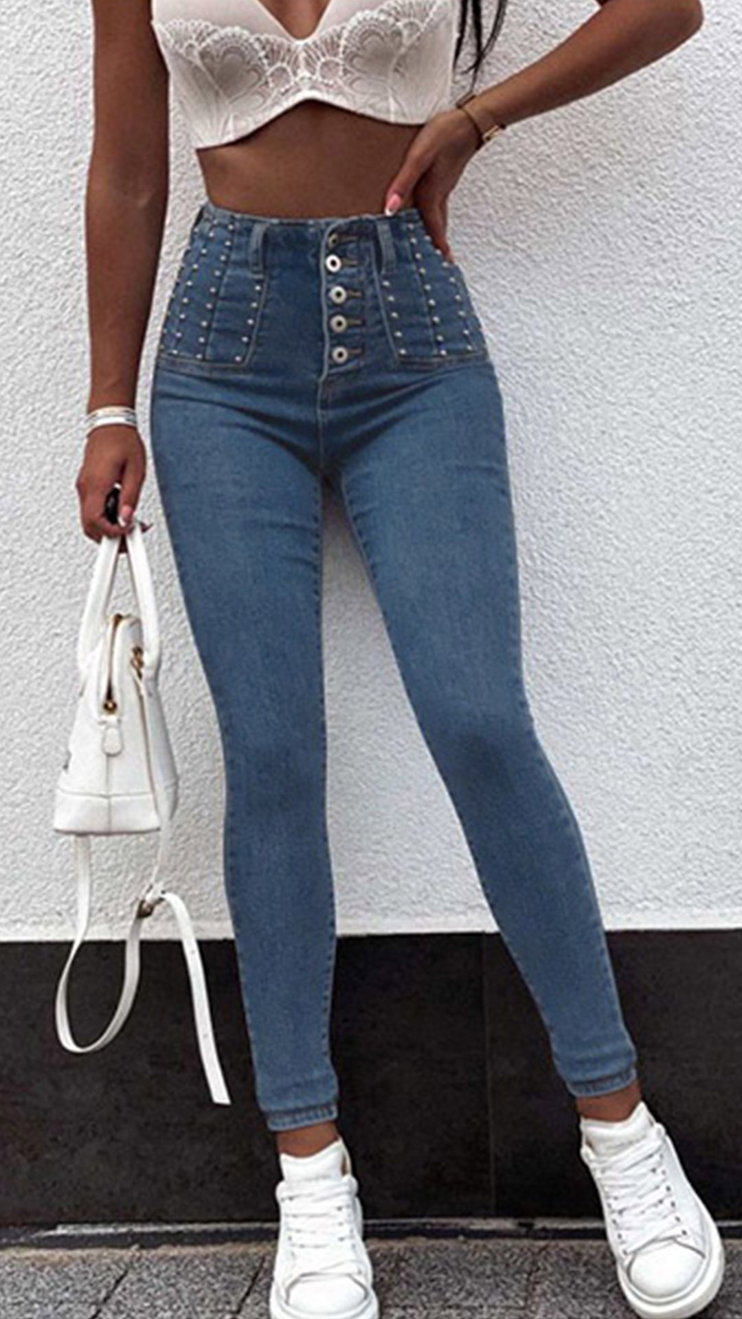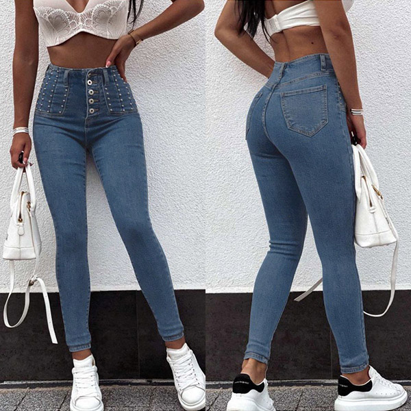 These fashionable and slim-fit jeans will make you look great no matter where you go! The high waisted and buttoned design will make you look slimmer and taller, while the beaded details will add a touch of elegance to your outfit.