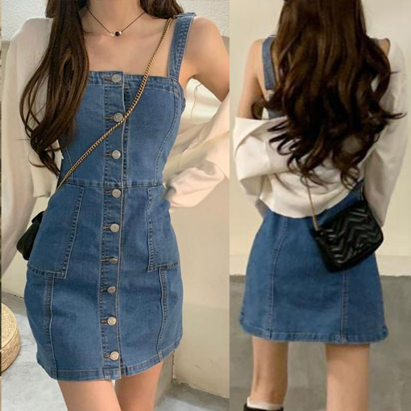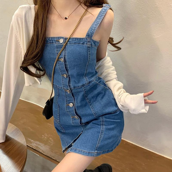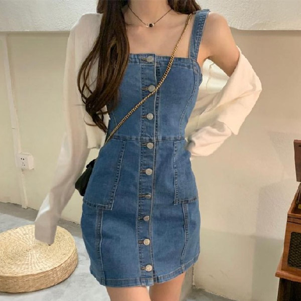 This denim dress features a straight-cut neckline and back, bodycon silhouette, front button-down design, and belt adding a touch of glamour.