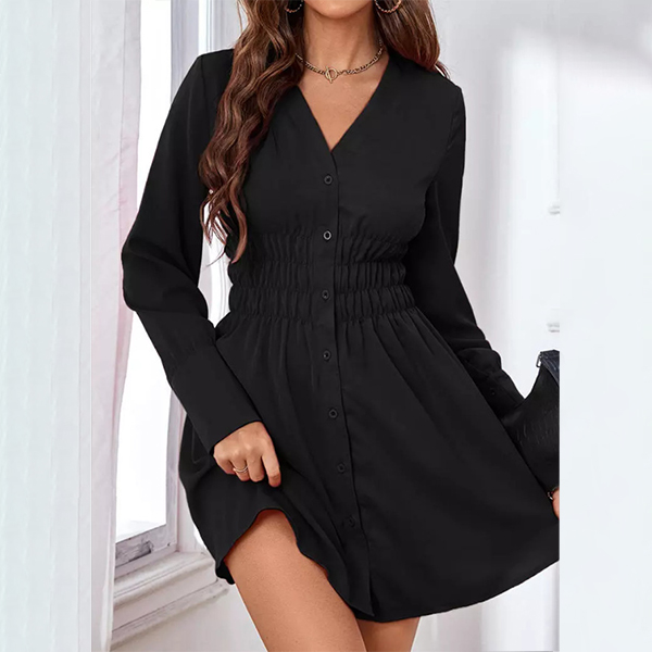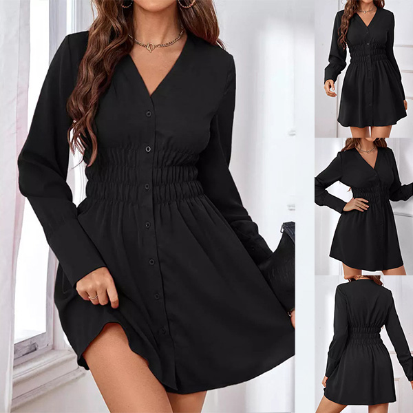 How about this dress? The classic black hue is timeless and flattering, while the V-neckline and buttoned front create a chic silhouette. The smocked waistline for a perfect fit and the long sleeves provide an extra layer of warmth and coverage, wanna have one?