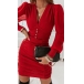 Fashion Buttoned V-neck Long Sleeve Ruched Bodycon Red Dress