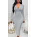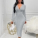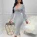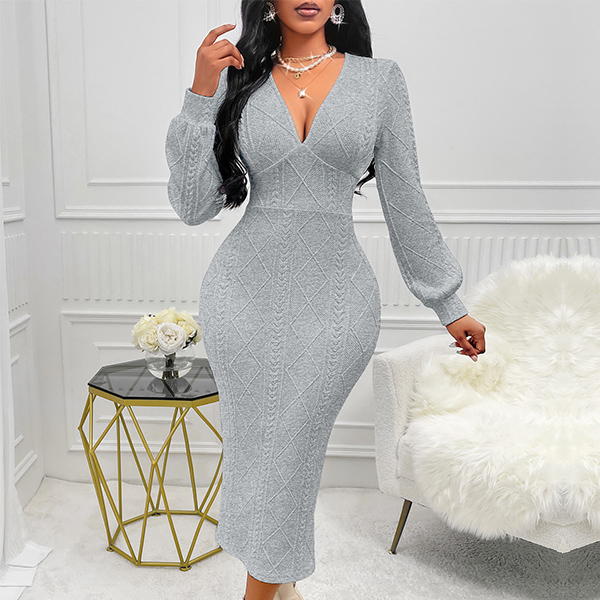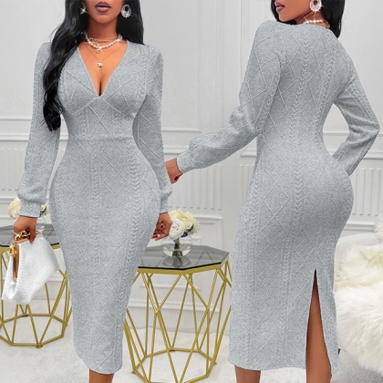 Fashion Cable Pattern V-neck Long Sleeve Back Slit Bodycon Dress