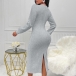 This gray dress features a cable pattern design, V-neckline, long sleeves, and a back slit detail, creating a chic and stylish look. We could pair it with boots for a more casual yet stylish ensemble. Hope you like it.