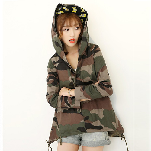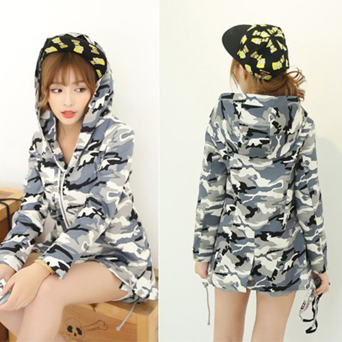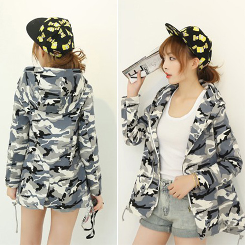 This coat features camouflage print pattern,fashion and popular. Long sleeve,front zipper closure,hooded design,hemline with drawstring design. Let this coat gives you a wonderful day.