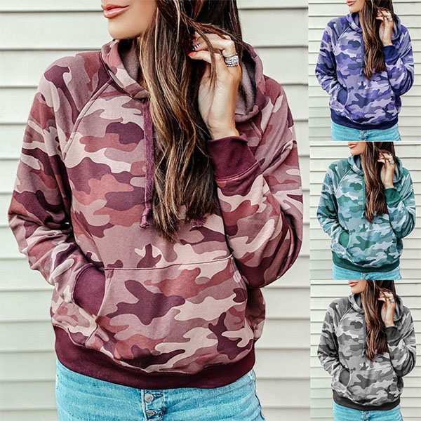 Make your autumn wardrobe more complete by adding this sweatshirt. The camouflage printed details can make this piece look more stylish and attractive. Finished with long sleeve,hooded silhouette and front pocket design,this sweatshirt can offer you a laid-back and fashionable autumn look by teaming with your jeans.