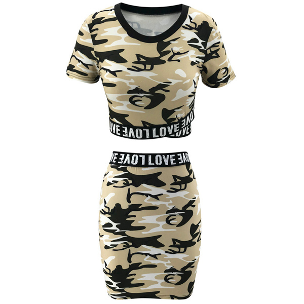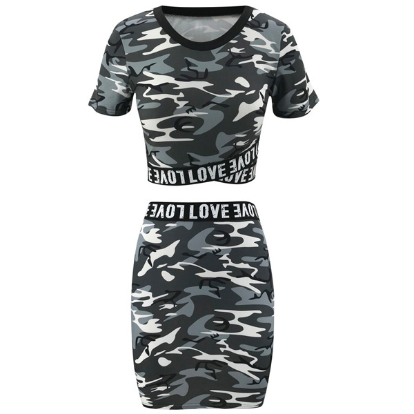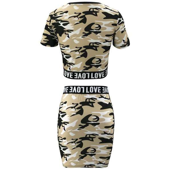 Embrace the warmth of a sunny weekend with this two-piece set. The camouflage printed and letters spliced details make it look so eye-catching. Including a short sleeve round neck t-shirt and a high waist skirt,this two-piece set is sure to flaunt off your perfect figure while it exudes your charming feminine appeal.