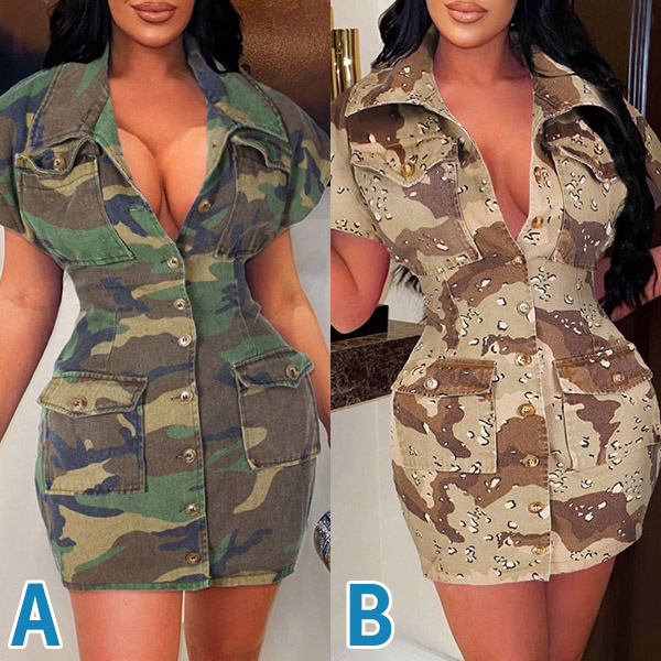 Fashion Camouflage Printed Stand Collar Cap Sleeve Patch Pockets Shirt Dress
