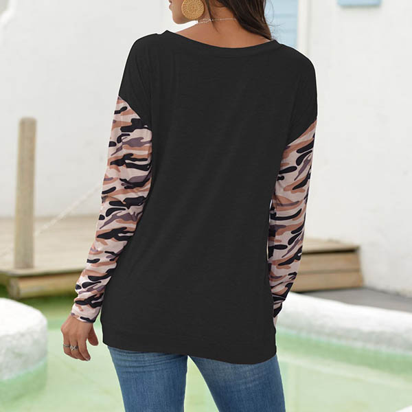 Fashion Camouflage Spliced Long Sleeve Round Neck Crossover Hem T-shirt