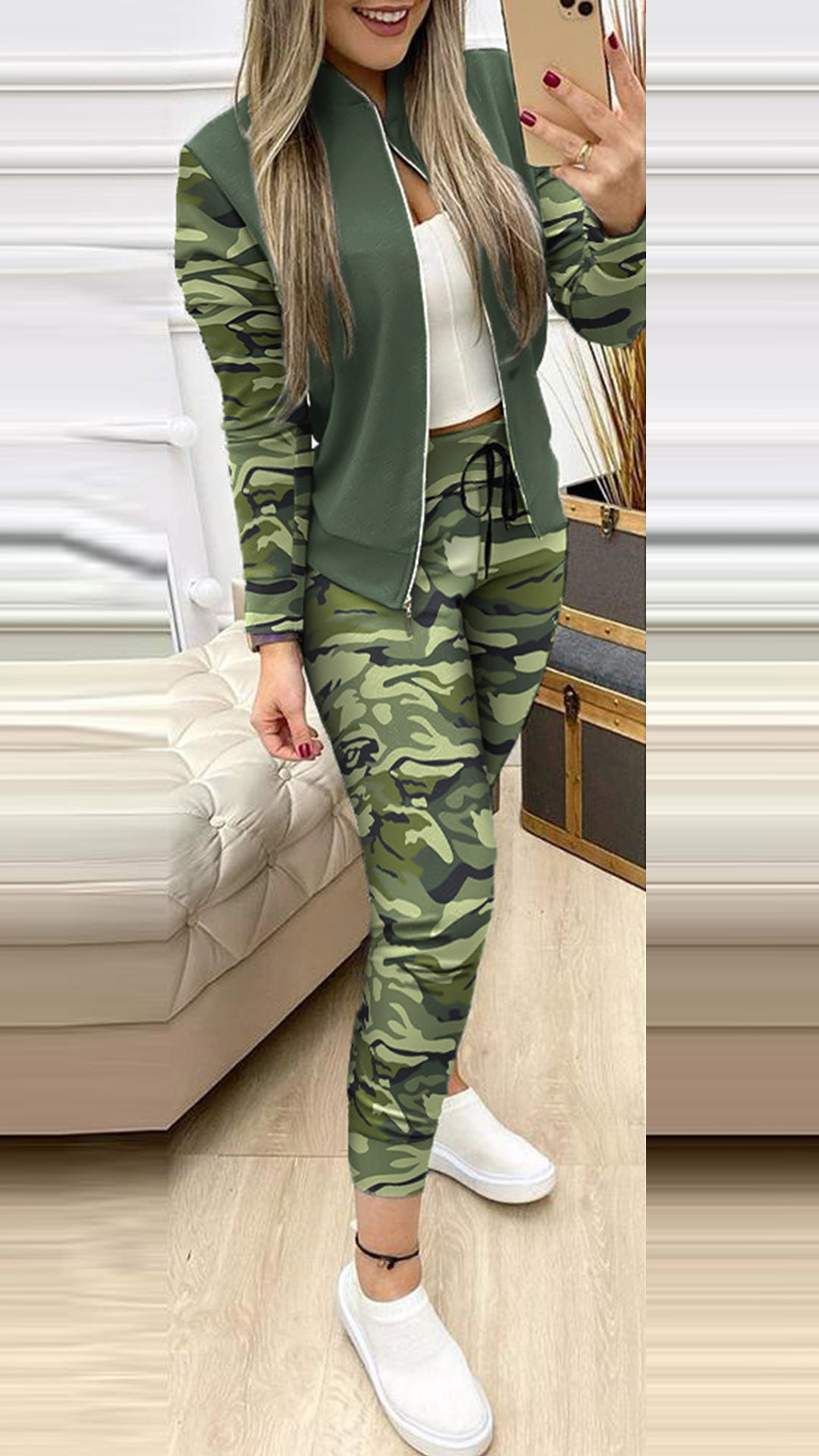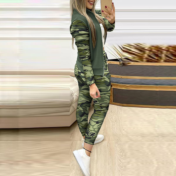 Fashion Camouflage Spliced Long Sleeve Sweatshirt Coat + Pants Two-piece Set