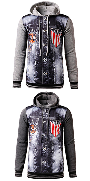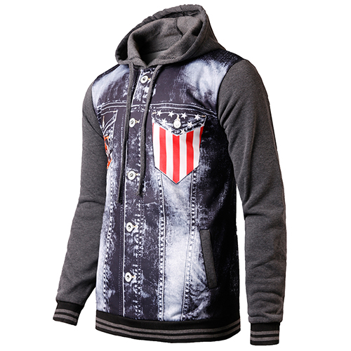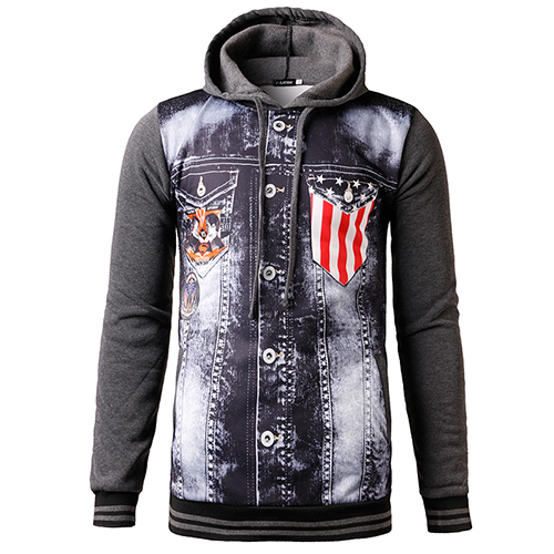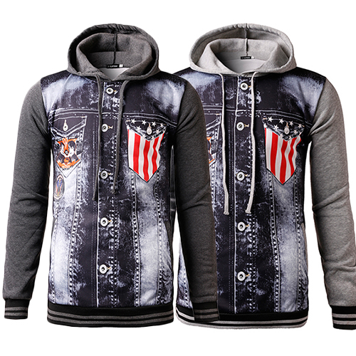 The hoodie coat is outfitted with 3D printed design, which creates a denim atmosphere. It is styled with