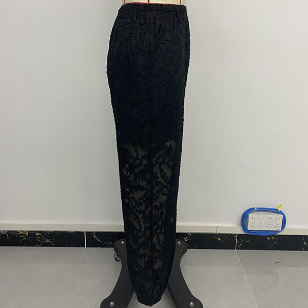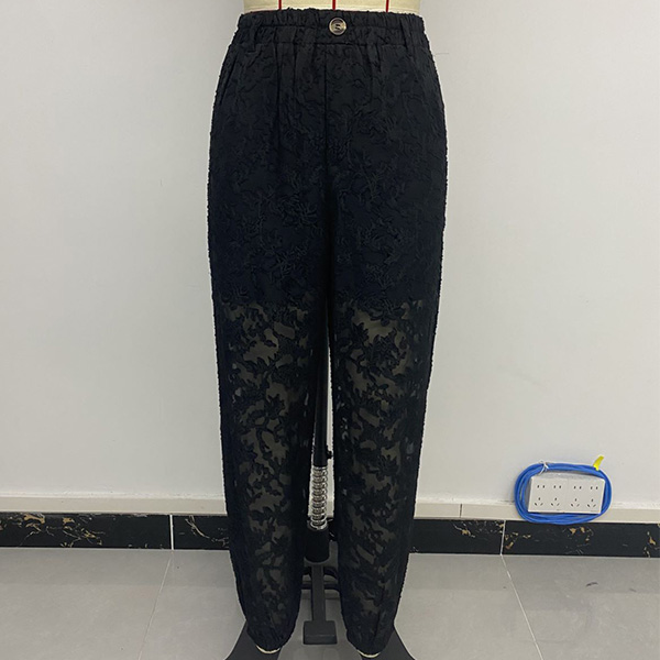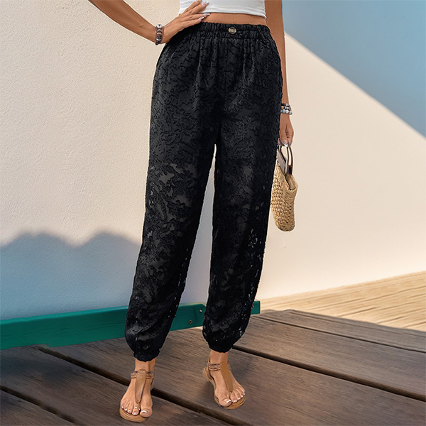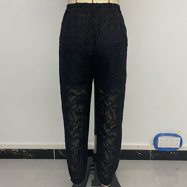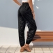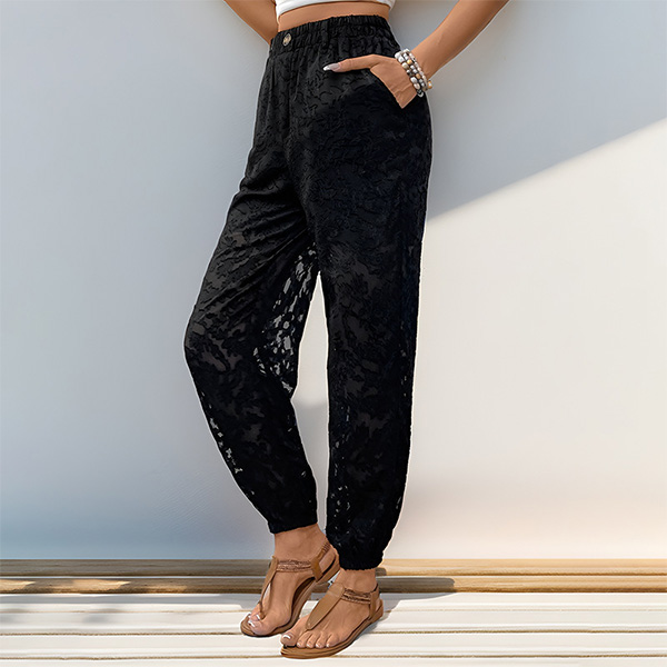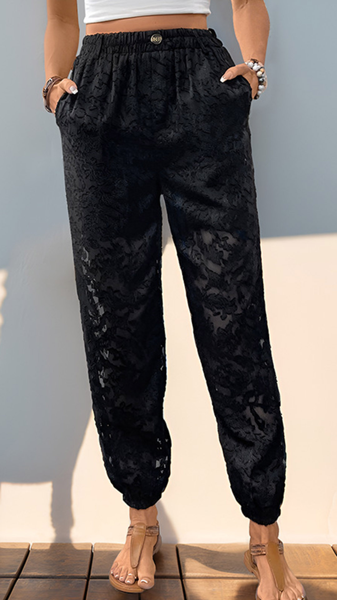 These elevated jogger pants combine a modern, high-waisted silhouette with a unique textural fabric, resulting in a versatile and fashion-forward bottom that can seamlessly transition from casual to dressy occasions.