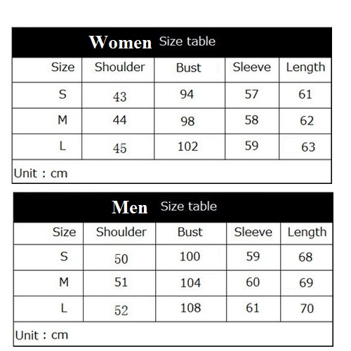 M : Bust : 98cm(38.58"); Shoulder : 44cm(17.32"); Sleeve : 58cm(22.83"); Length : 62cm(24.41");