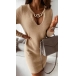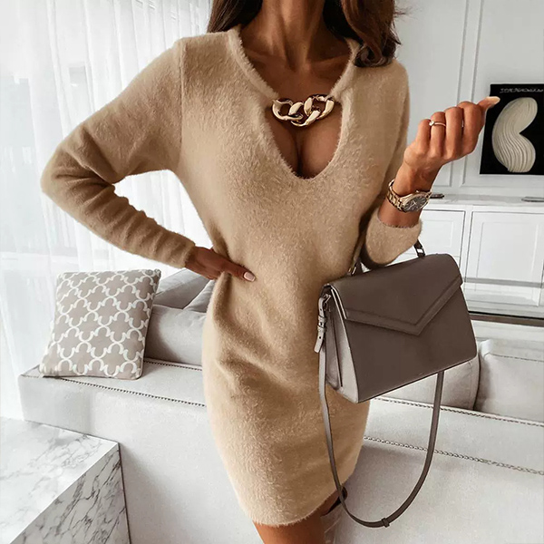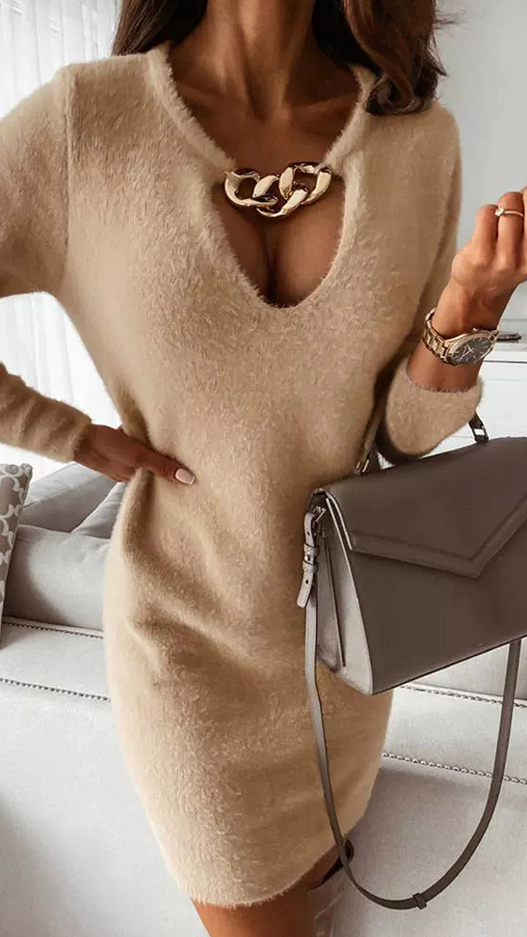 This plush dress features a crew neckline with chain decoration, front cutout detail, long sleeves, and plush fabric, creating a chic and edgy look. The plush fabric adds a luxurious and cozy feel to the dress. Pair it with boots and a leather jacket for a more casual yet stylish look.