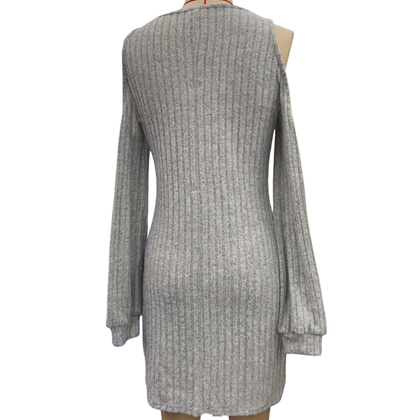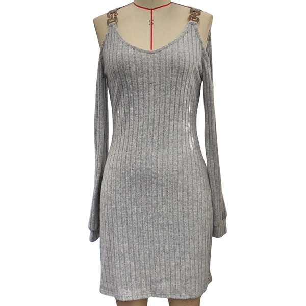 Fashion Chain Shoulder Strap Open-shoulder Long Sleeve Ribbed Dress