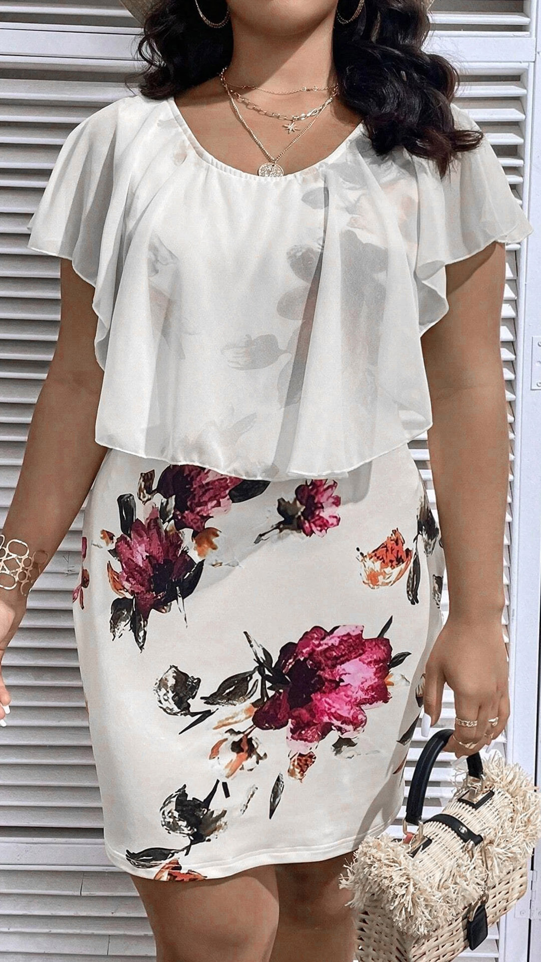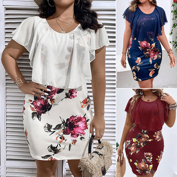 Fashion Chiffon Ruffled Spliced Floral Printed Round Neck Bodycon Plus-size Dress