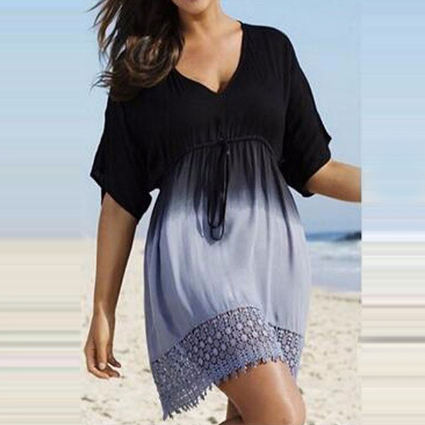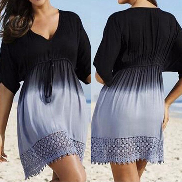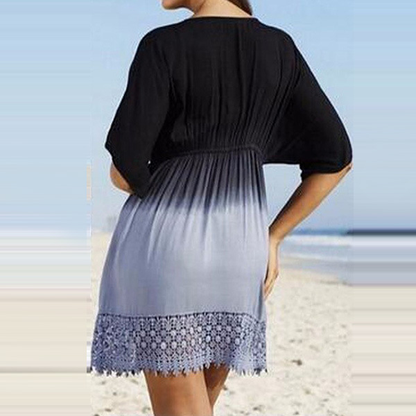 Color gradient style,accompanied with half sleeve,v-neck,elastic waist and lace spliced hem,chic and stylish.
