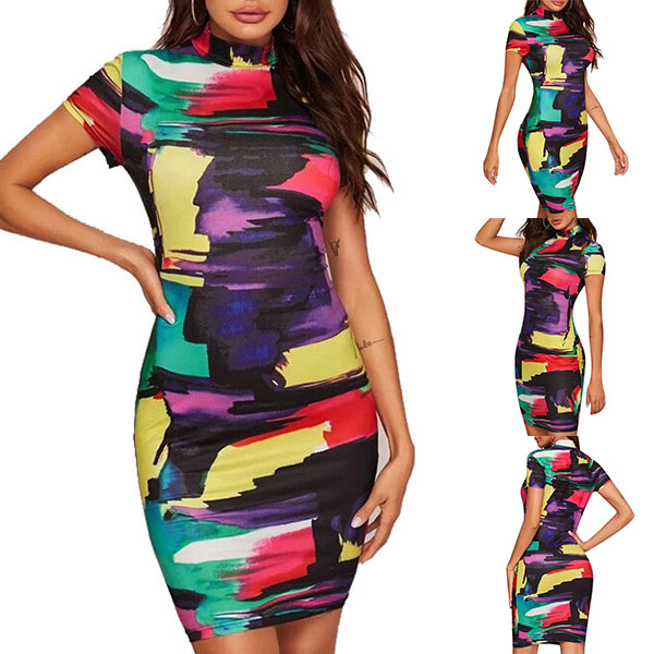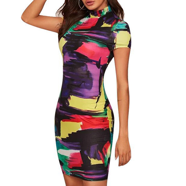 Fashion Colorful Printed Short Sleeve Mock Neck Slim Fit Dress