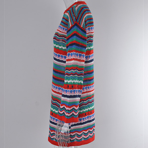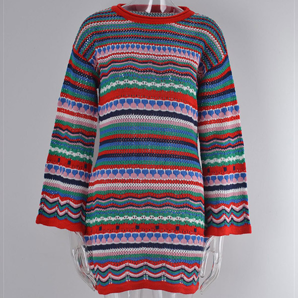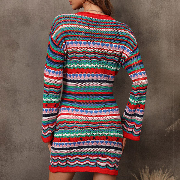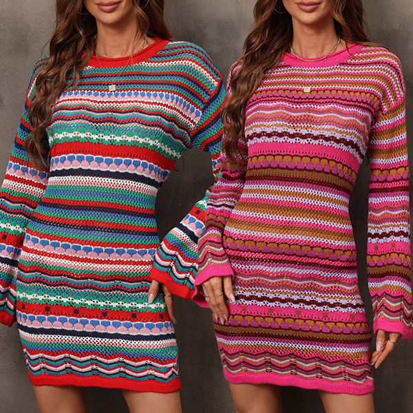 This eye-catching and colorful dress is perfect for making a statement! It features a fun and colorful striped pattern, a round neckline, long sleeves, and a fit and flare silhouette. Made from a soft and stretchy knit fabric, it's comfortable and flattering.