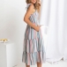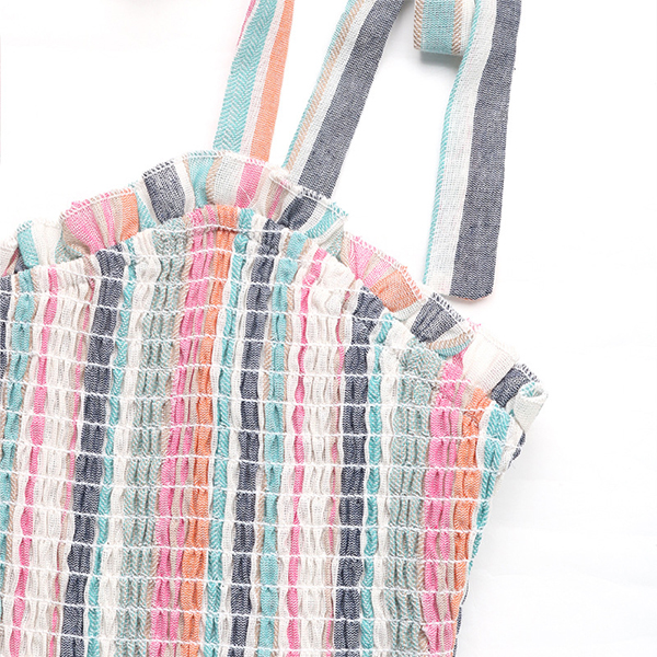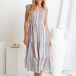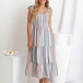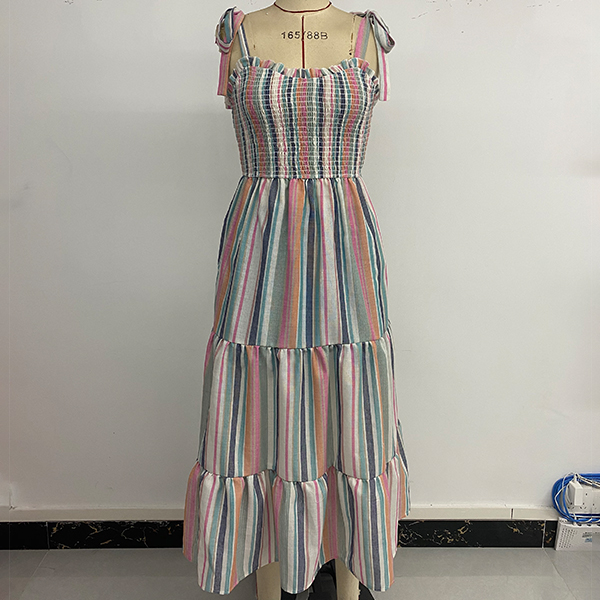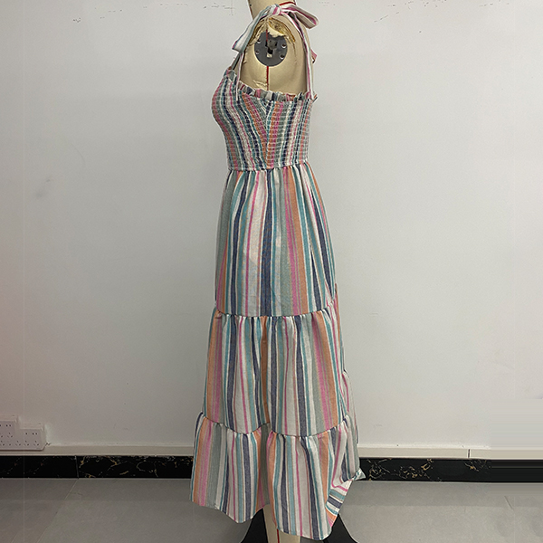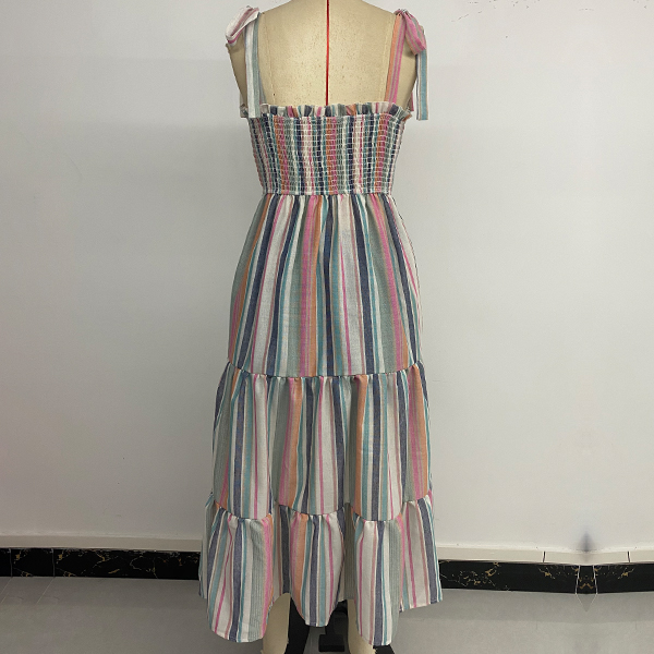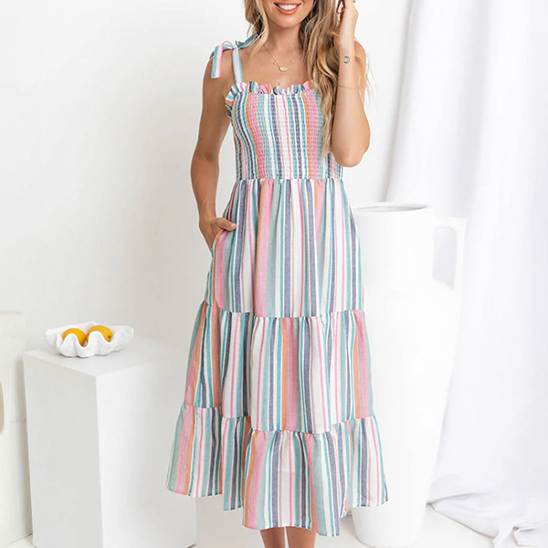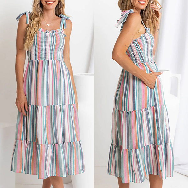 Fashion Colorful Stripe Printed Self-tie Shoulder Strap Smocked Bodice Tiered Dress