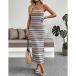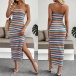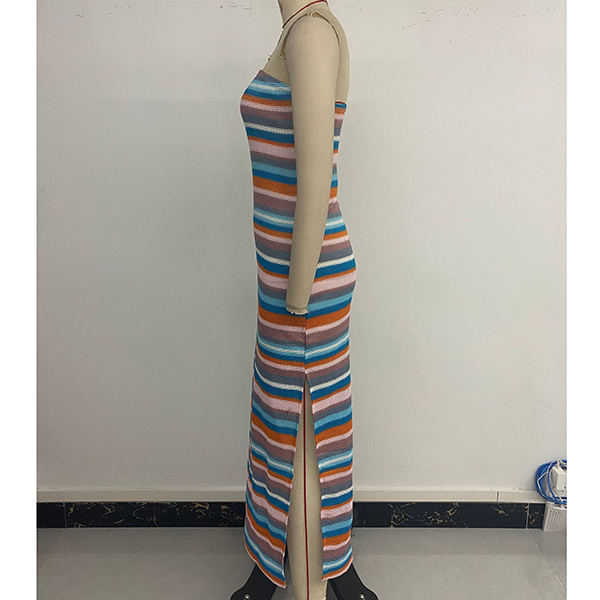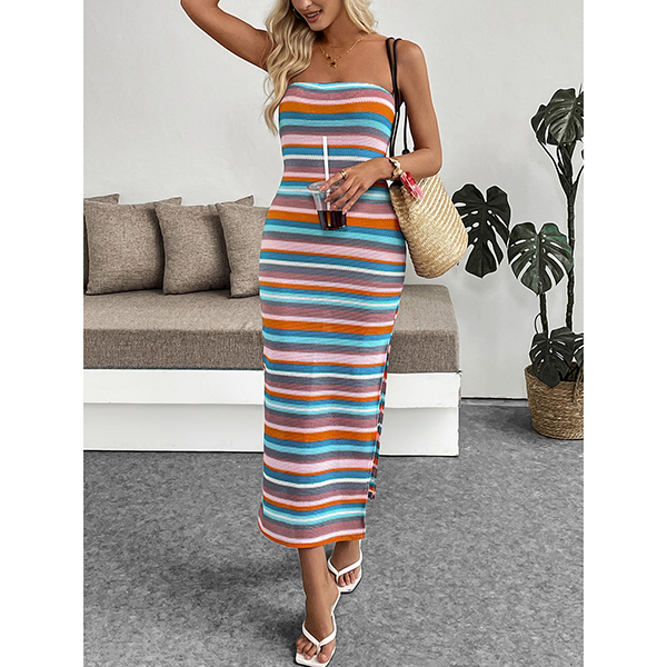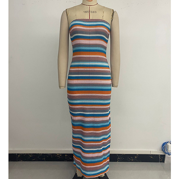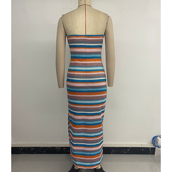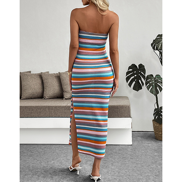 Fashion Colorful Stripe Printed Strapless Side Slit Bodycon Dress