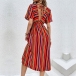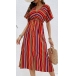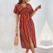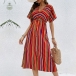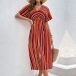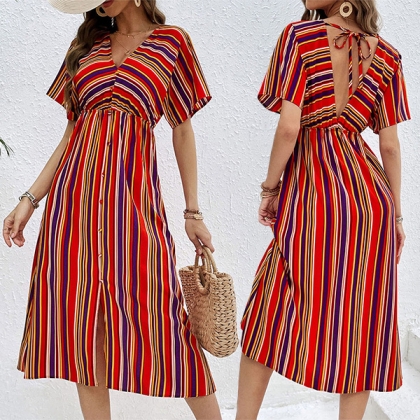 Fashion Colorful Stripe Printed V-neck Short Sleeve Backless Dress