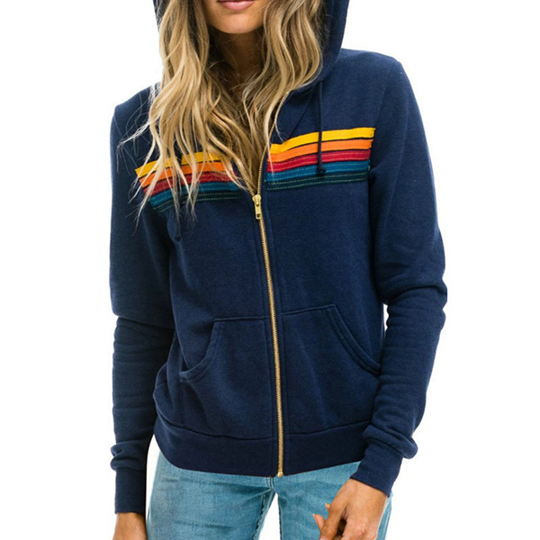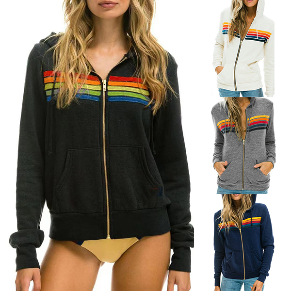 In these autumn days,this sweatshirt is a good way to keep you warm and comfy while it offers you a casual,relaxed and stylish style. It is finished with long sleeve and hooded silhouette,the colorful striped spliced design will boost its entire charm. Simply matching with your jeans to have a wonderful day.