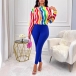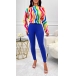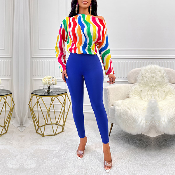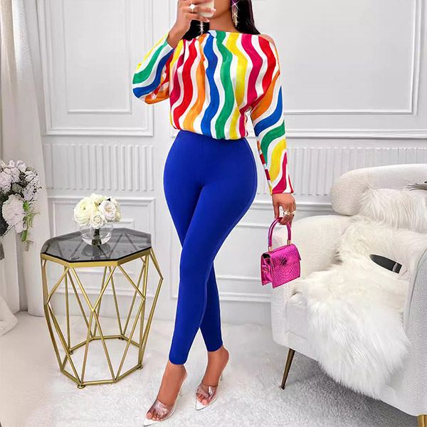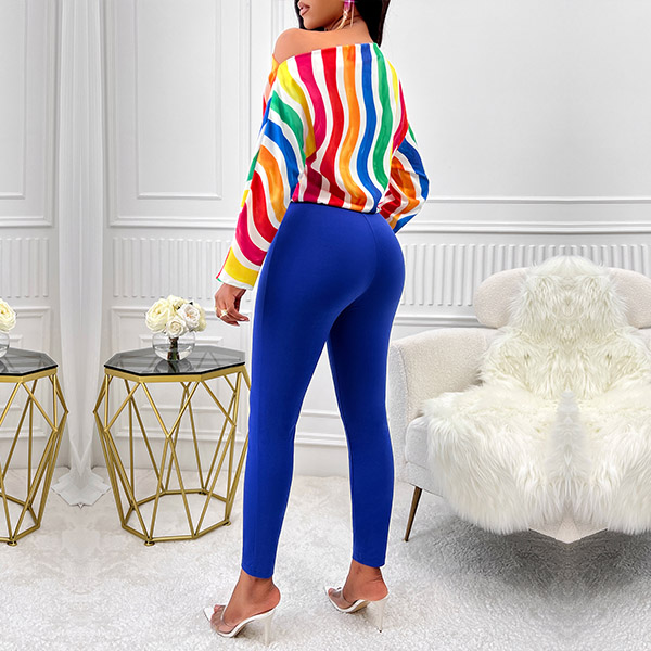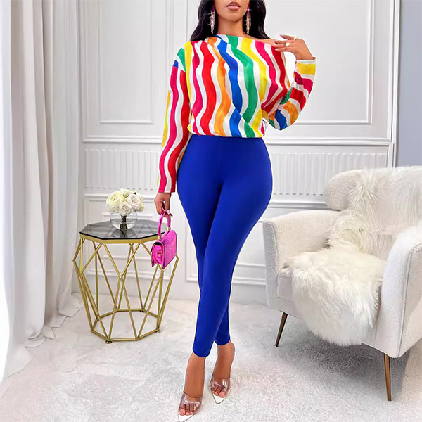 This fashionable two-piece set consists of a colorful stripe printed shirt and slim-fit pants, creating a vibrant and stylish ensemble. Hope you like it.