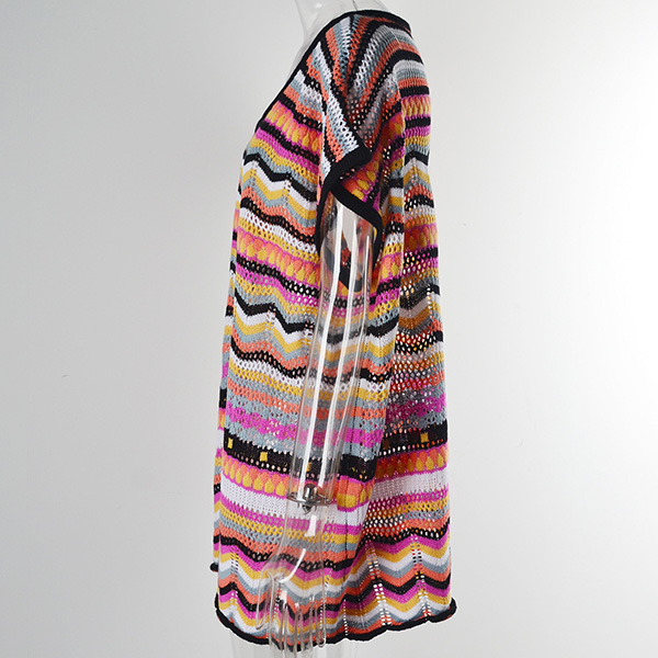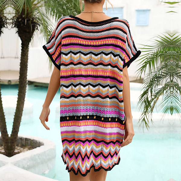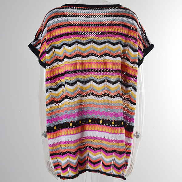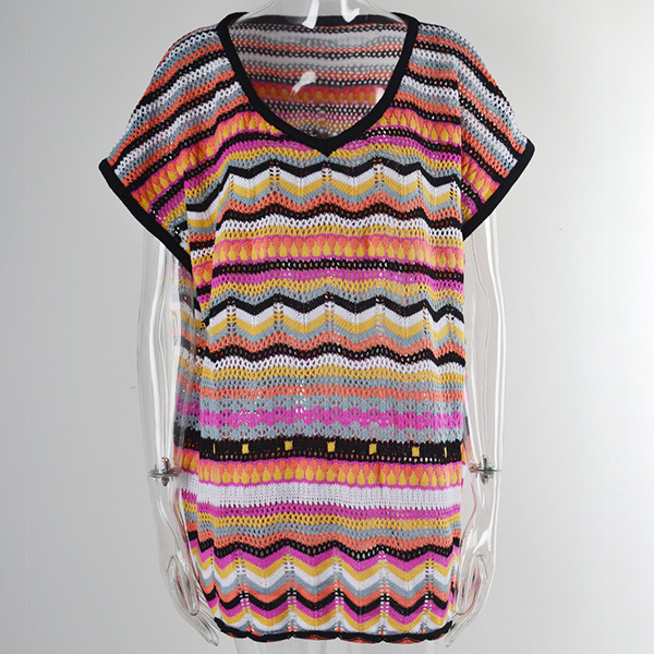 Fashion Colorful Wave Printed Round Neck Batwing Sleeve Swimming Cover-up Shirt