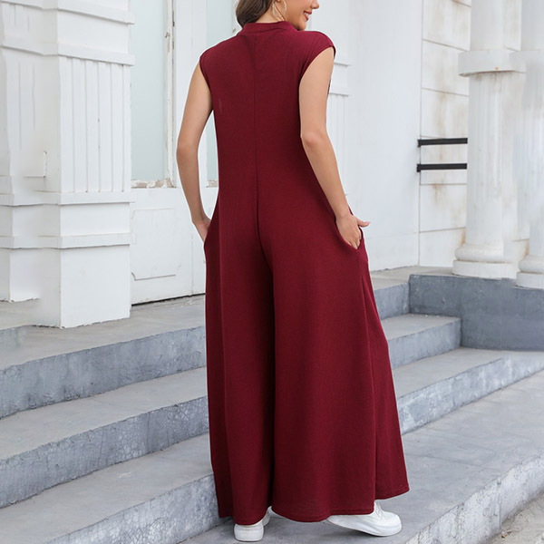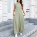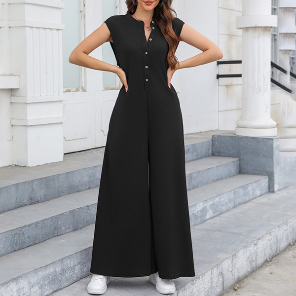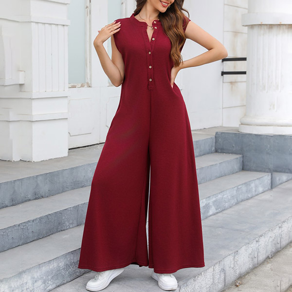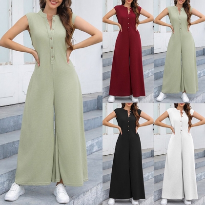 Fashion Comfy Front Buttoned Round Neck Sleeveless Wide-leg Jumpsuit