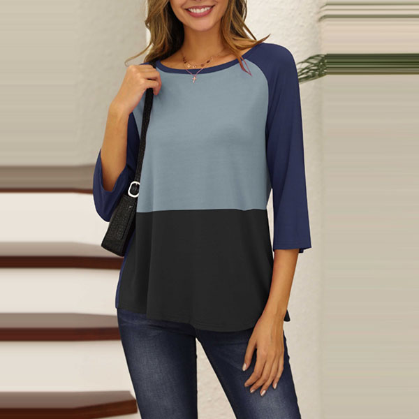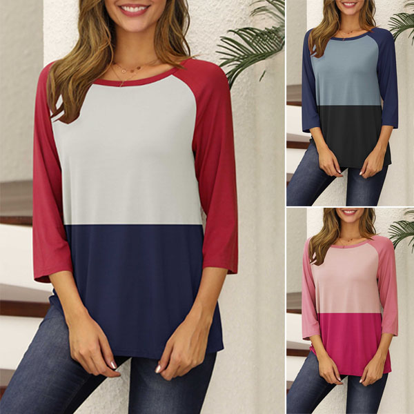 Fashion Contrast Color 3/4 Sleeve Round Neck Loose T-shirt