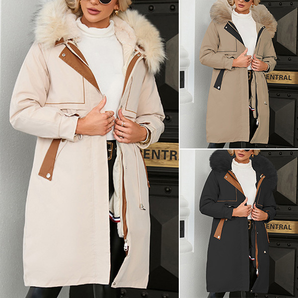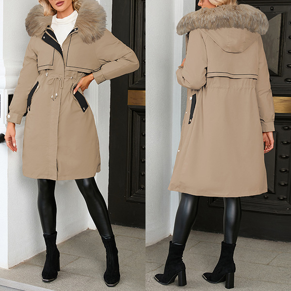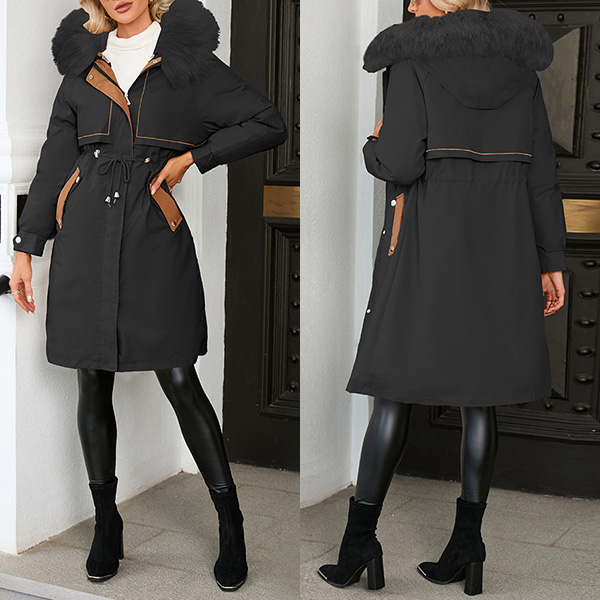 This coat is sure to keep you warm all winter! It features a fur spliced collar, long sleeves, and a longline silhouette. It also has a waist drawstring to cinch in the waist for a flattering fit. Layer this over your favorite outfits for a stylish look that will keep you cozy all season long.
