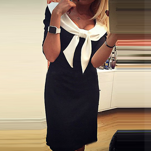 this breathtaking dress. Its contrast color round neck with bowknot design is the design highlight of this dress.