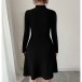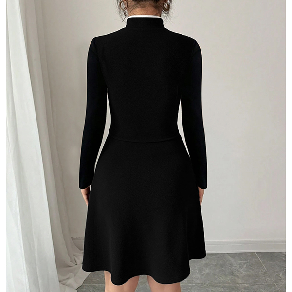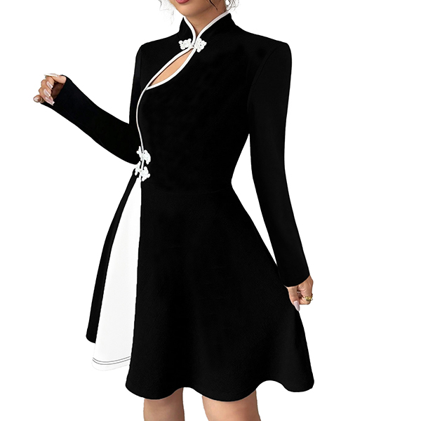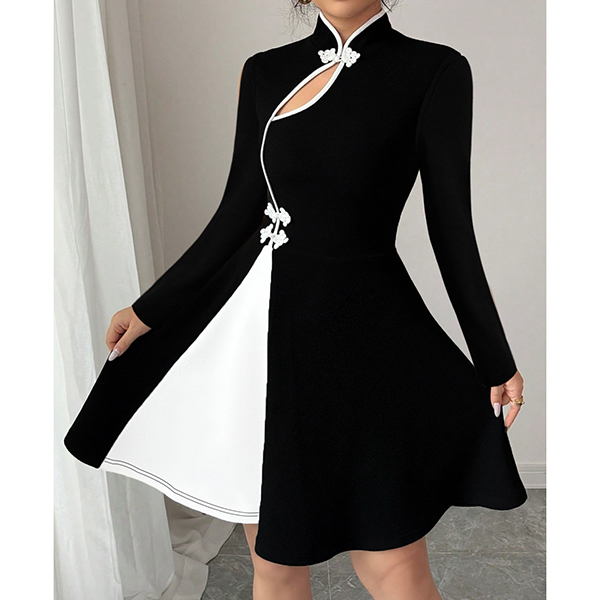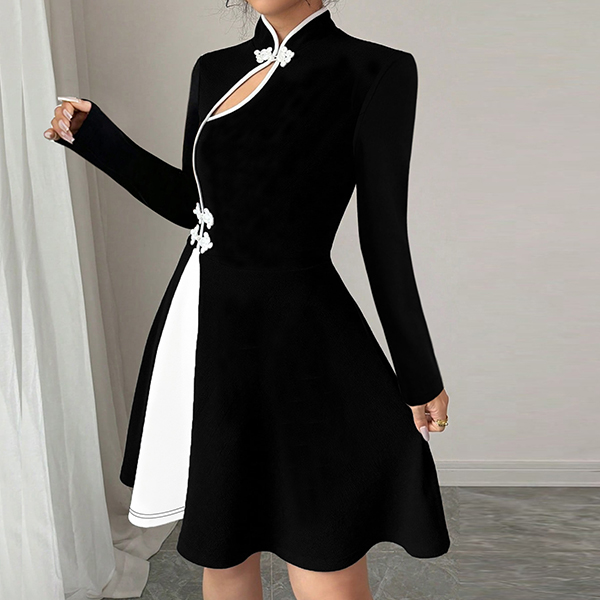 Fashion Contrast Color Button Knot Front Cutout Long Sleeve A-line Dress
