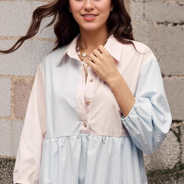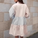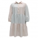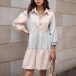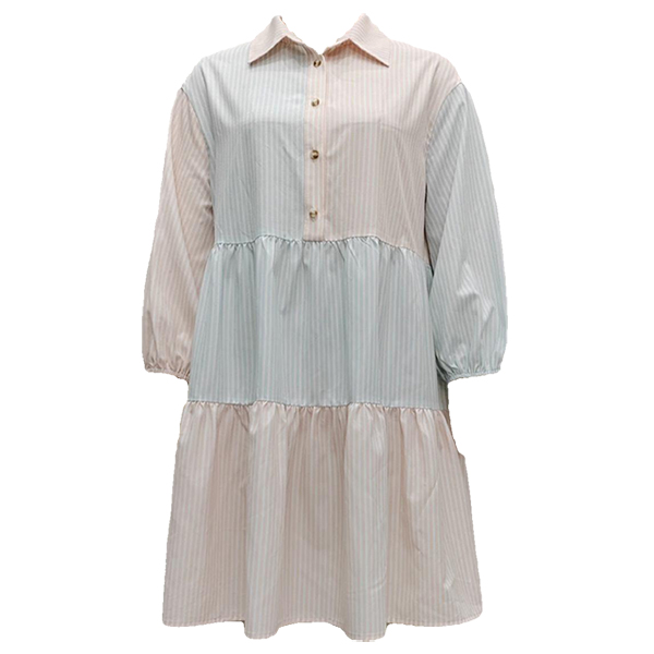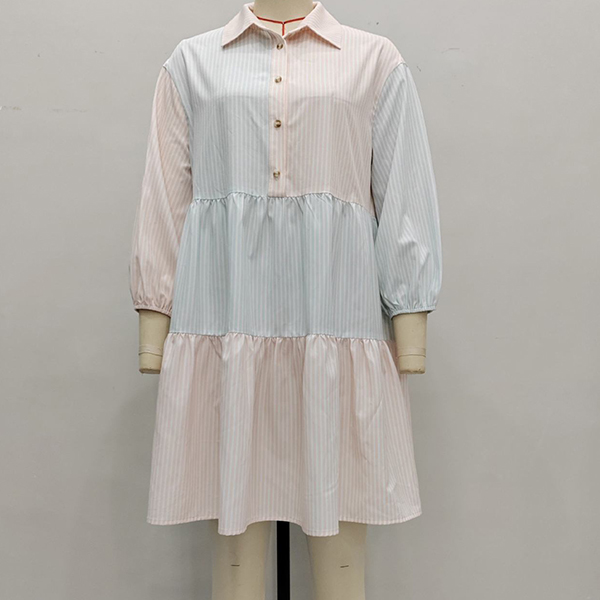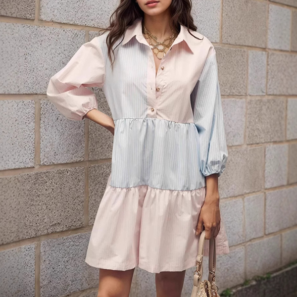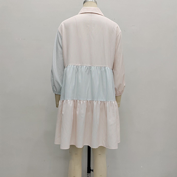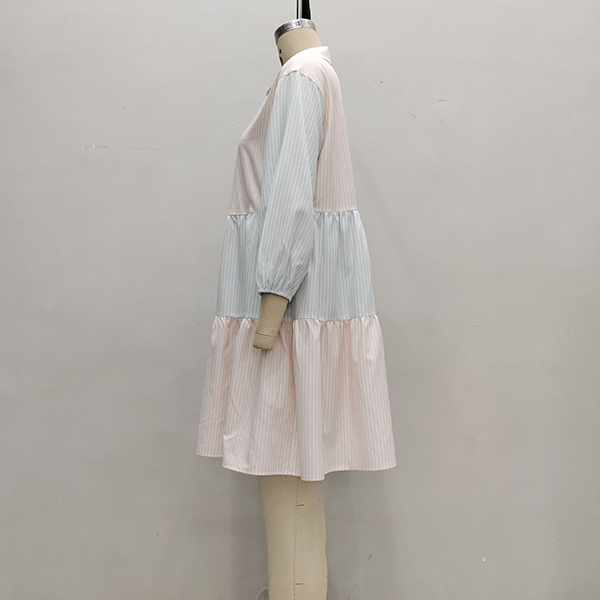 Fashion Contrast Color Button Stand Collar Elbow Sleeve Tiered Dress