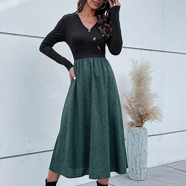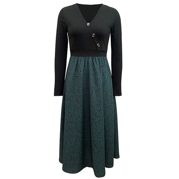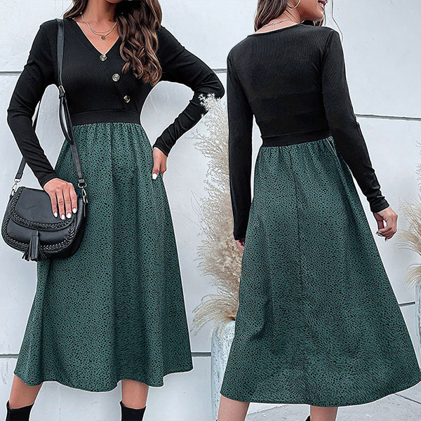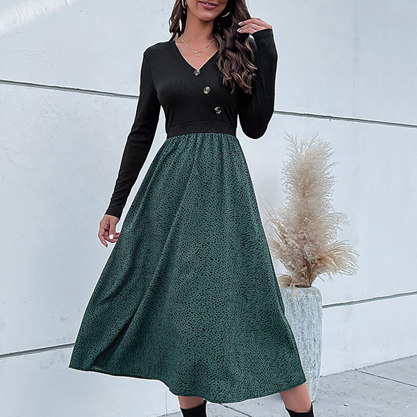 Fashion Contrast Color Buttoned V-neck Long Sleeve Printed A-line Dress
