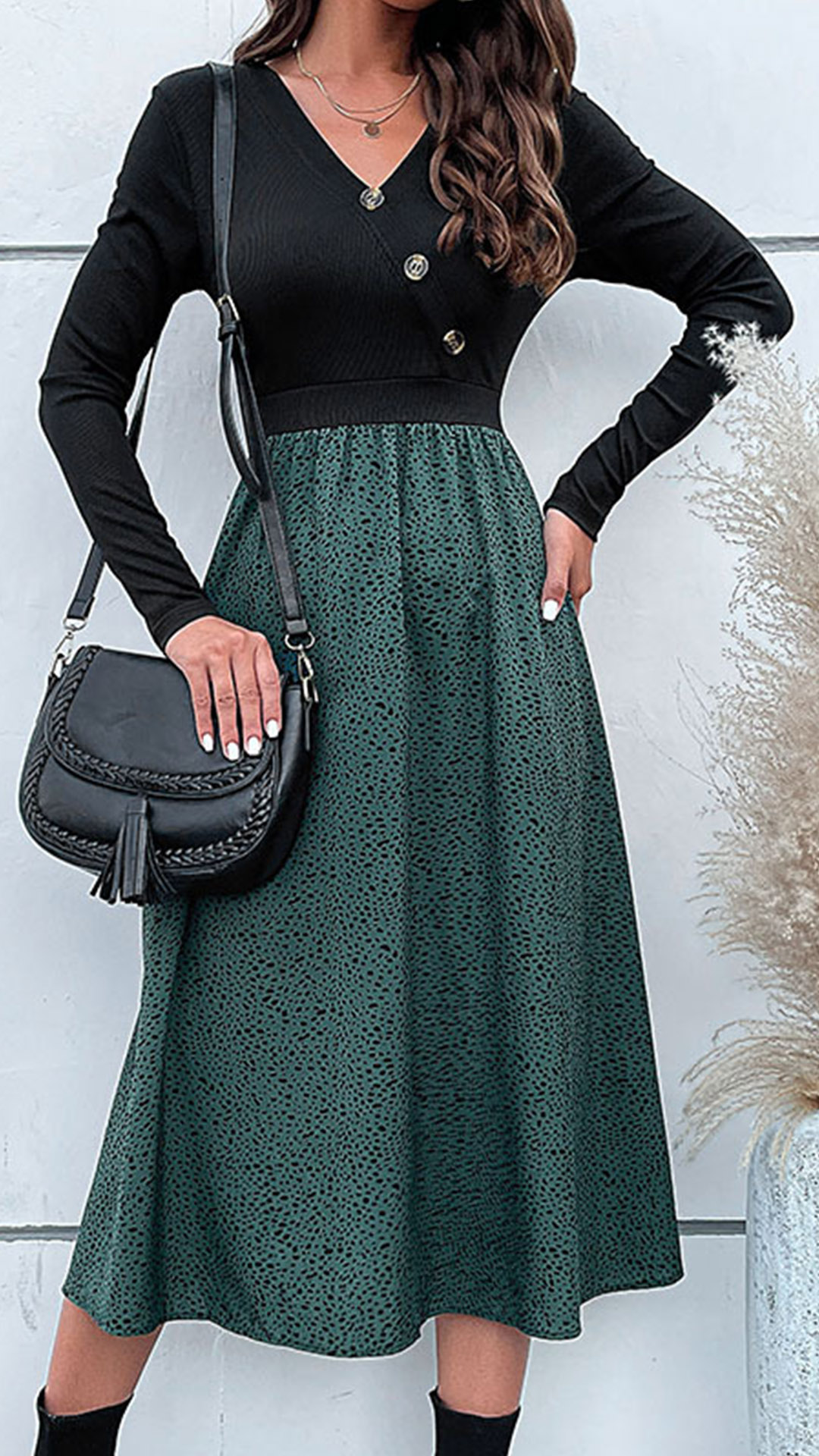 Make a stylish statement with this A-line dress. I like the black button V-neck bodice design, and you? The printed pattern adds a playful and fashionable element to the dress, making it perfect for both casual outings and special occasions. Hope you like it.