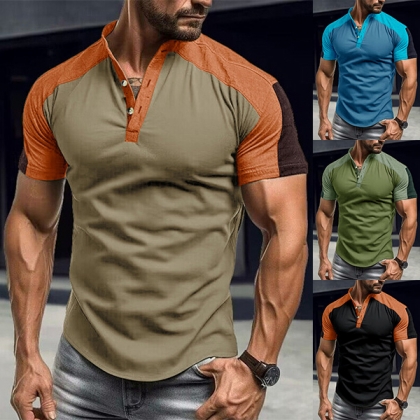 Fashion Contrast Color Buttoned V-neck Short Sleeve Shirt for Men