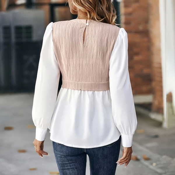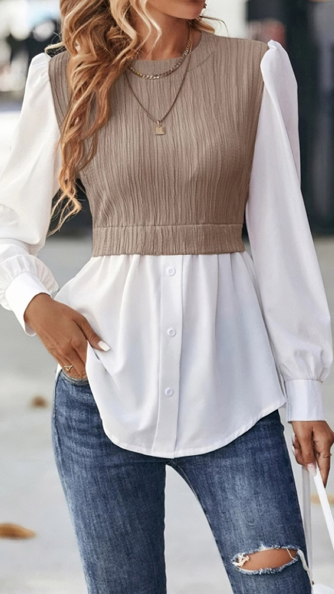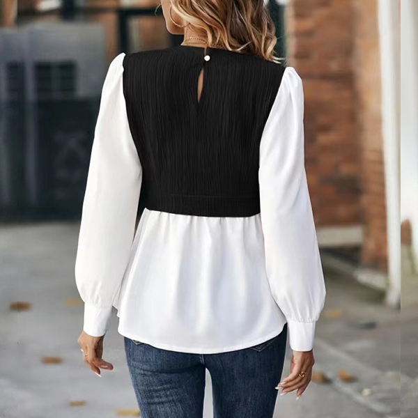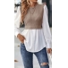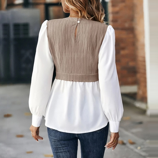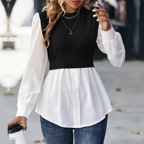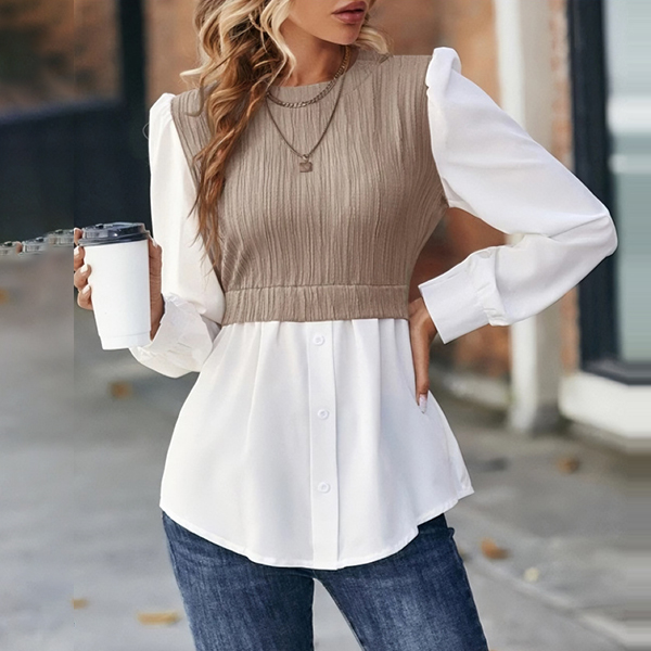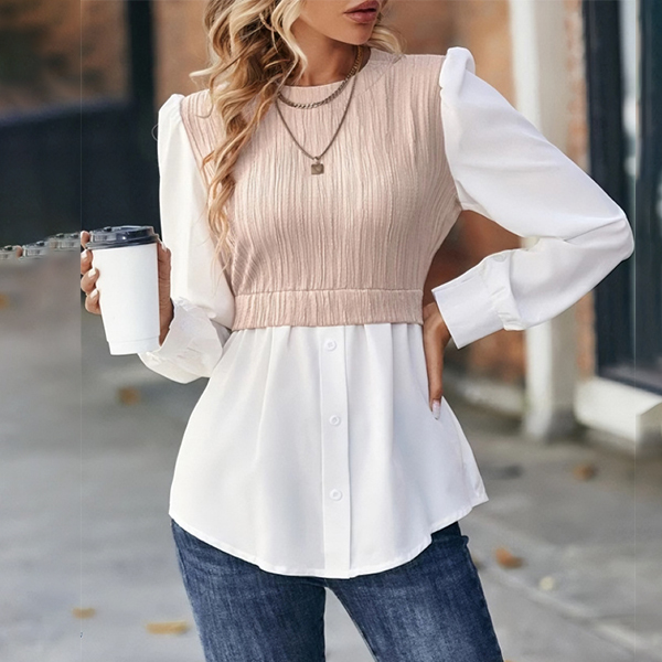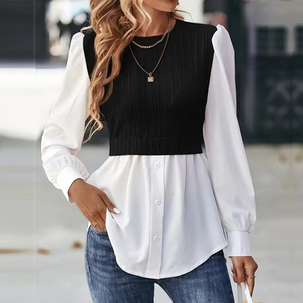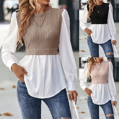 Fashion Contrast Color Crew Neck Long Sleeve Mock-two-piece Shirt