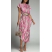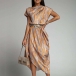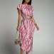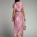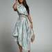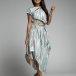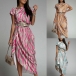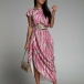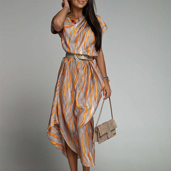 This dress features contrast colors printed design, a crew neckline, short sleeves, and an irregular hemline for a fashionable and contemporary design. It is a stylish and modern piece that offers a unique and eye-catching look.