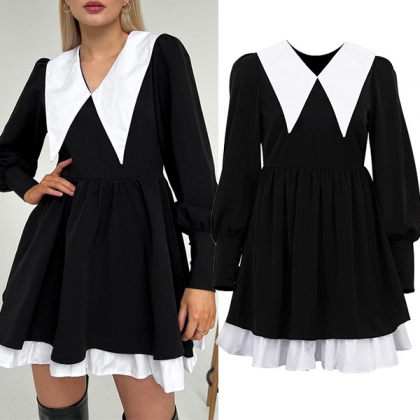 Fashion Contrast Color Doll Collar Long Sleeve Long Sleeve Dress