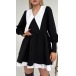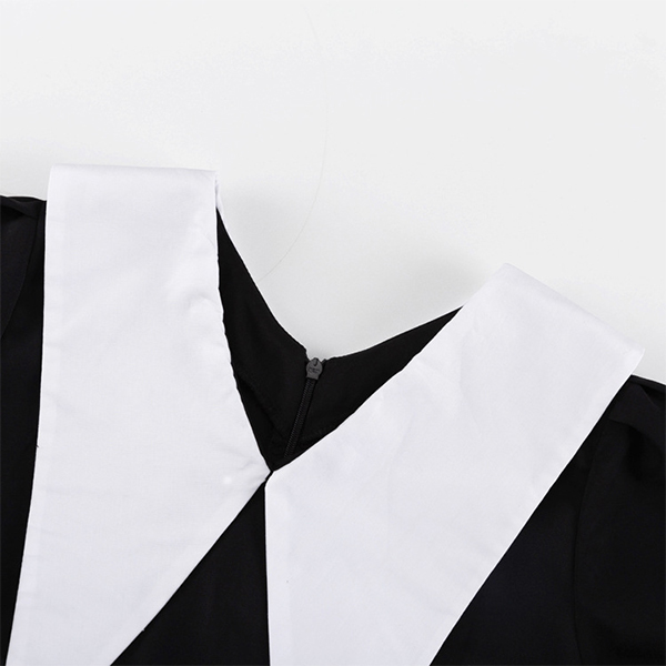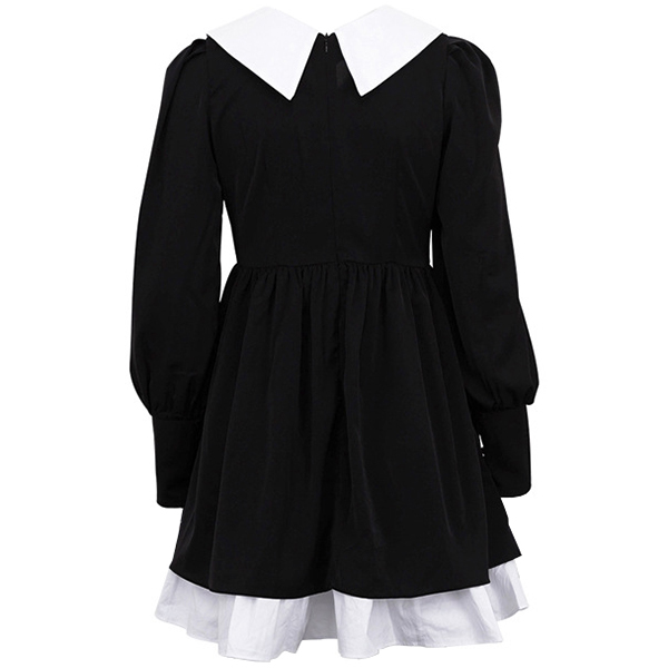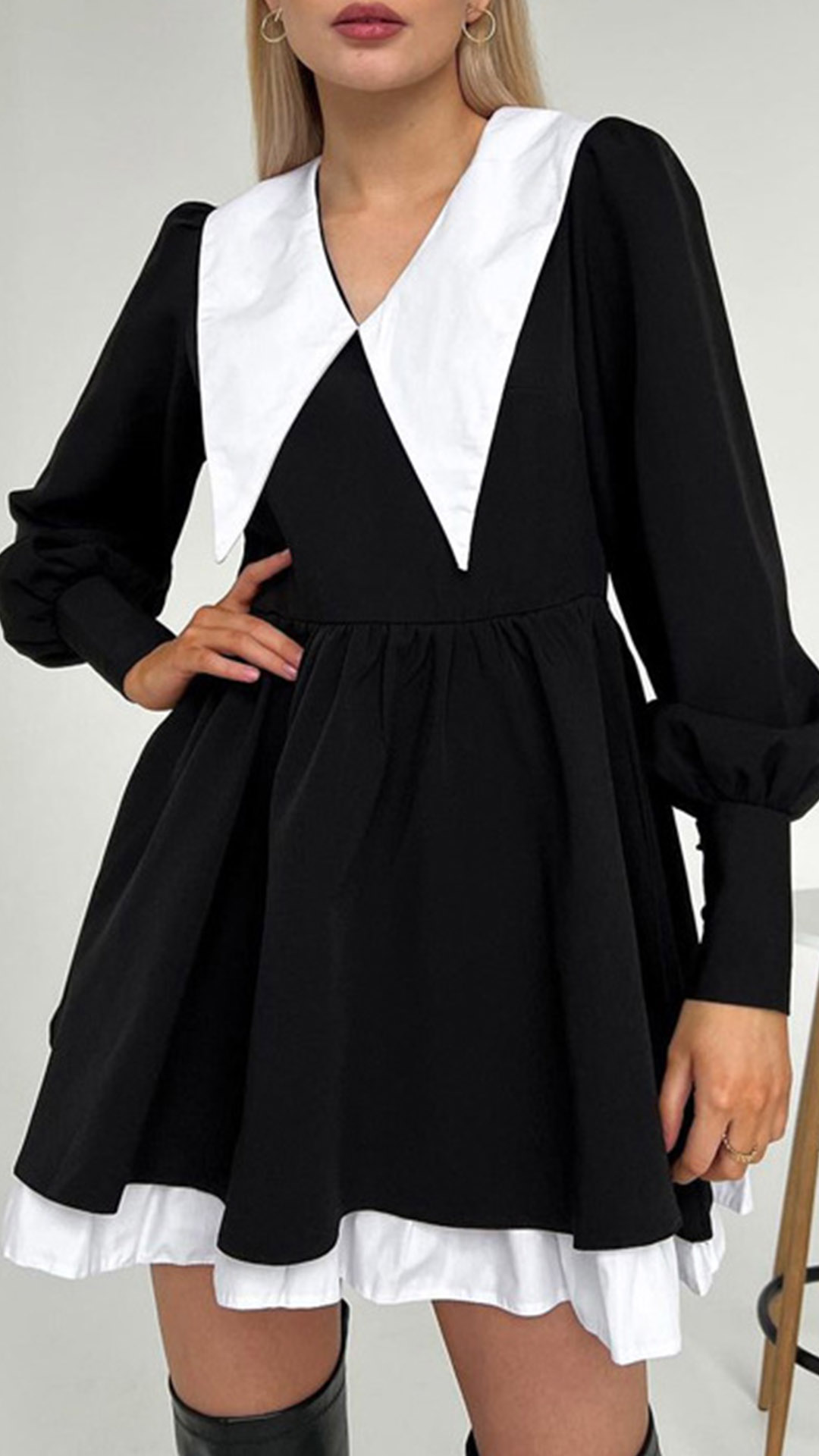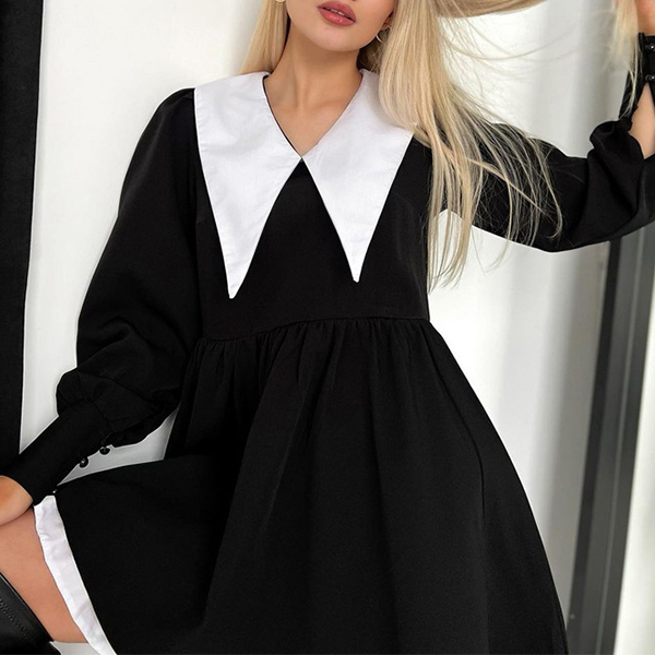 This is a fashionable long-sleeved dress with a doll collar and a contrasting color design. It has a fit & flared slihoutte that accentuates the figure, and the doll collar adds a touch of cuteness and elegance to the overall look. It is perfect for any occasion where you want to look both stylish and feminine.