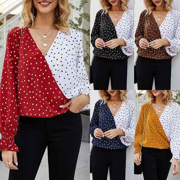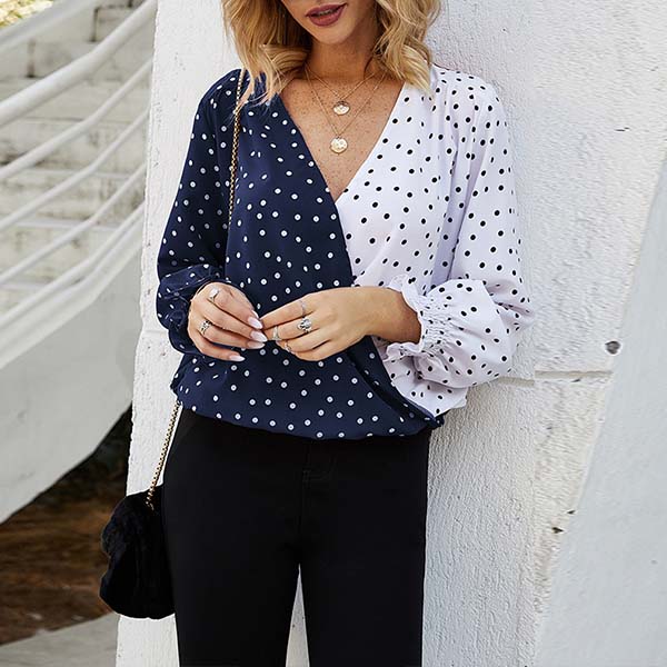 You can stay cozy yet keep feminine in this wonderful blouse. Contrast color and dots printed details make this piece look so eye-catching,while the v-neck design can make you look sexy and flirty. It is a perfect addition for a stylish and charming daily look.