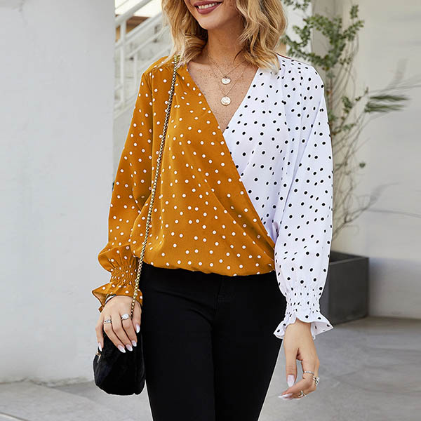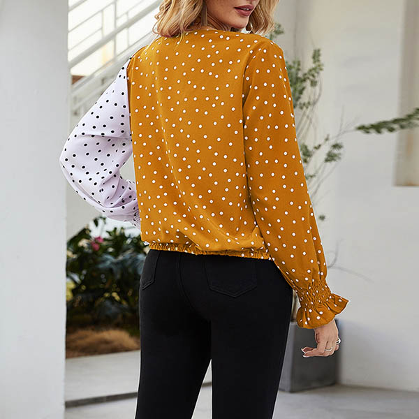 Fashion Contrast Color Dots Printed Long Sleeve V-neck Blouse